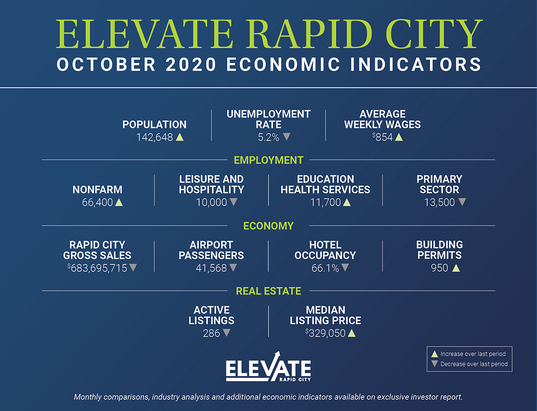 October’s economic indicators for the Rapid City trade area show continued economic recovery. Unemployment decreased to 5.2%. Average weekly wages increased almost 16% year over year. Gross sales climbed by almost 4% over last year’s spending. And building permits rose significantly.