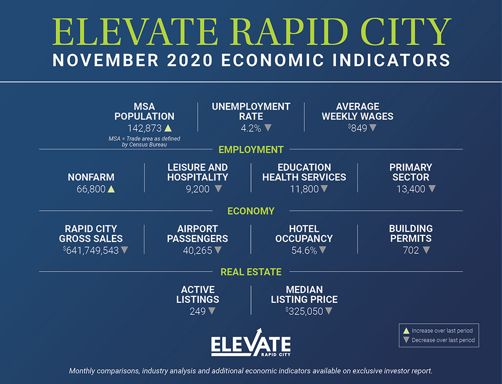 Clint Eastwood starred in the 1966 film The Good, the Bad and the Ugly, and there’s a little bit of each in November’s Economic Indicators. First, the good—continued stabilization in Rapid City’s unemployment rate, down to 4.2% from 5.2% the previous month. While this is not quite at the pre-Covid number of 3.6%, it’s within shooting distance. In addition, wages, gross sales, building permits, and (congrats to our friends at Visit Rapid City) hotel occupancy are up from where they were last year at this time. The bad—air passenger traffic continues to lag and commercial vacancy rates are up just over 11% from last year. However, this is a national trend and not specific to Rapid City or the region. The ugly—Covid-19 cases continue to peak in the Black Hills, which could short-circuit the region’s return to economic normalcy in the first quarter of 2021.