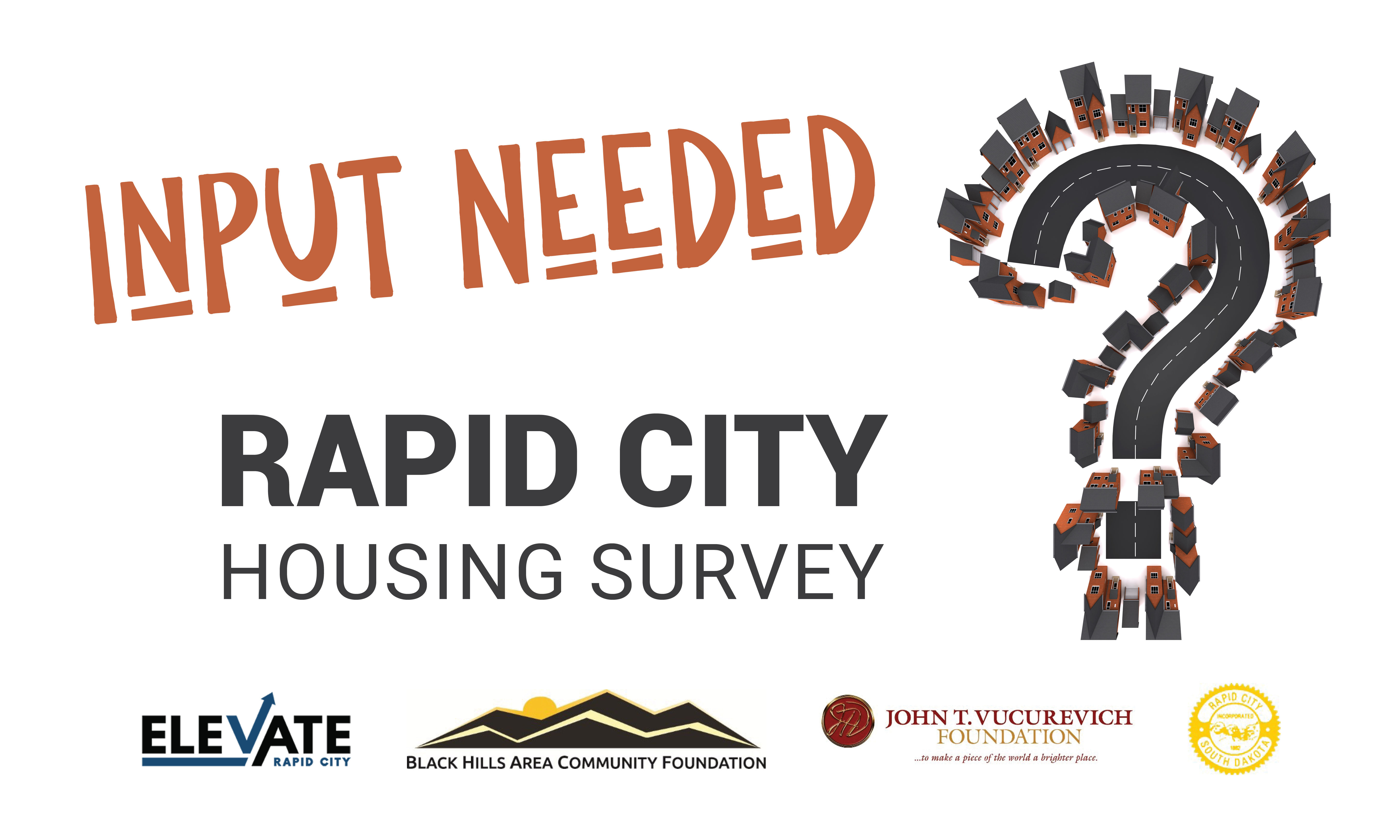 Rapid City area residents are asked to provide input for a Rapid City area housing survey. This survey is a component of the regional housing study and needs assessment being completed through a partnership with Elevate Rapid City, Black Hills Area Community Foundation, City of Rapid City, and the John T. Vucurevich Foundation.