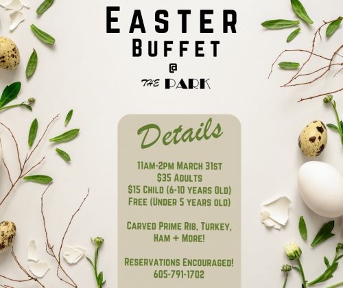 At 707 Mountain View Rd, The Park invites you to indulge in Easter brunch from 11 am to 2 pm. Feast on prime rib, turkey, ham, and more at $35 for adults, $15 for children aged 6-10, and free for children under 5. Reservations are encouraged and can be made by calling 605-791-1702.