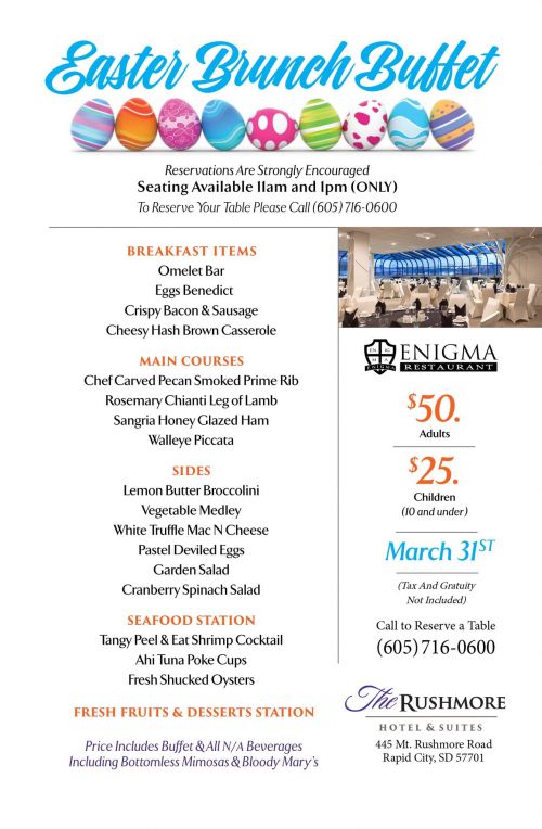 Located at 445 Mt Rushmore Rd, indulge in an extraordinary Easter Brunch Buffet from Enigma Restaurant at The Rushmore Hotel & Suites on the second floor. With an expanded menu featuring fresh seafood, salads, and dessert stations, this brunch promises an unforgettable dining experience from 11:00 am to 1:00 pm. Adults dine for $50, while children aged 10 and under are $25. Reserve your table by calling 605-716-0600 and treat yourself to a culinary adventure.