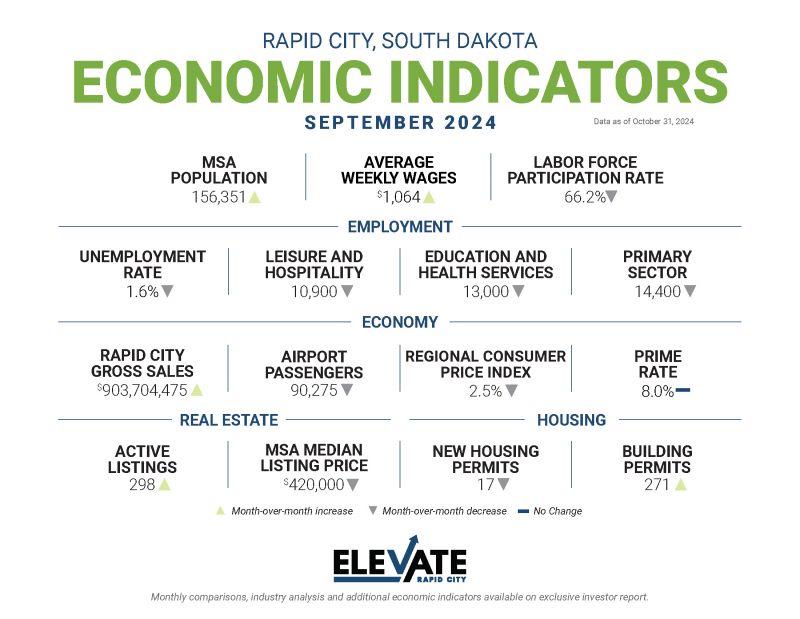 This month’s economic indicators are a lot like that—the philosophical punction mark you didn’t know you needed. That’s because we’re back to record levels of low unemployment, wages that are growing twice as fast as the costs of housing (and triple that of overall inflation), and consumer spending last month was over $900 million in Rapid City. Additionally, airport passenger and building permits ticked up for the first time in a few months, signaling that we are very likely on the other side of the inflation puzzle for good. And the time of this writing, it appears as though the Fed believes that to be the case as well, cutting the overnight rate by a quarter percent.